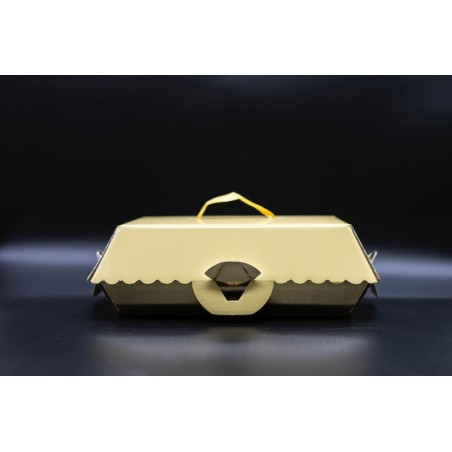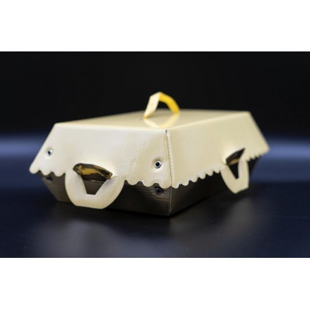 Cofanetto porta dolci realizzato  con microonda accoppiata al teso, plastificato. Disponibile in sei dimensioni, risulta perfetto per contenere dolci. È molto facile da assemblare con la sua chiusura ad incastro (a paracadute) ed è comodo da immagazzinare. Fondo interno esterno film oro/argento. Ogni confezione contiene 110 cofanetti.