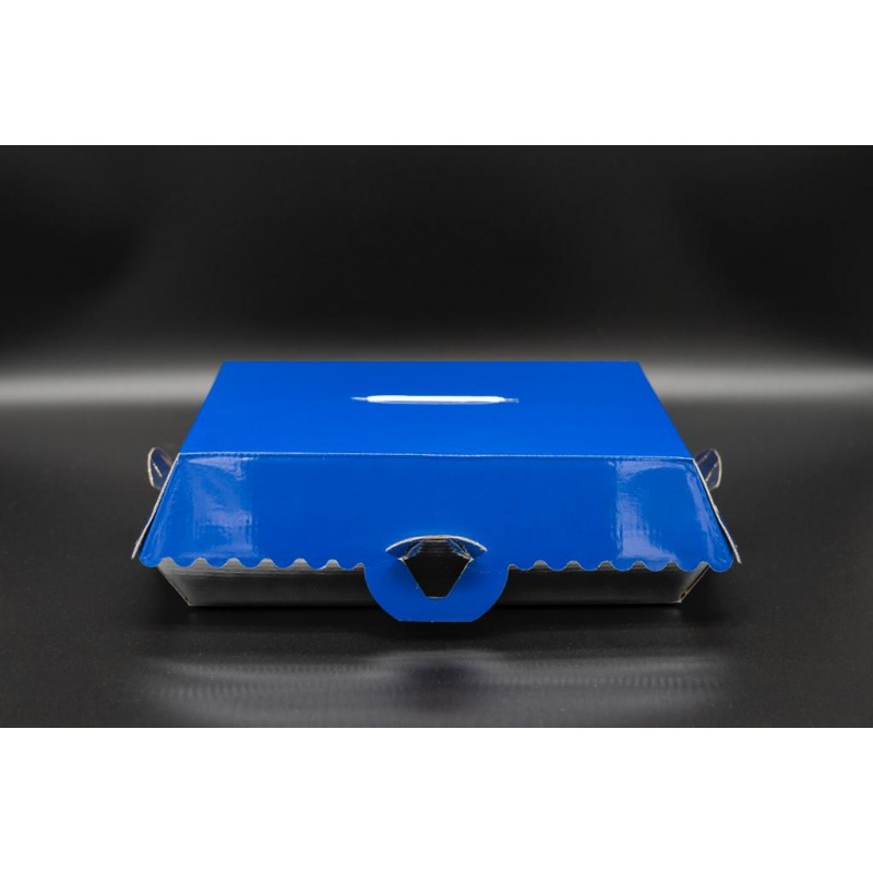 Cofanetto porta dolci realizzato  con microonda accoppiata al teso, plastificato. Disponibile in sei dimensioni, risulta perfetto per contenere dolci. È molto facile da assemblare con la sua chiusura ad incastro (a paracadute) ed è comodo da immagazzinare. Fondo interno esterno film oro/argento. Ogni confezione contiene 50 cofanetti.