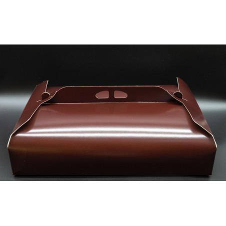 Realizzata in cartone teso. Apertura a scatto sui laterali. Una pratica maniglia rende agevole il trasporto, Interno alimentare neutro. Confezione da pz. 50.