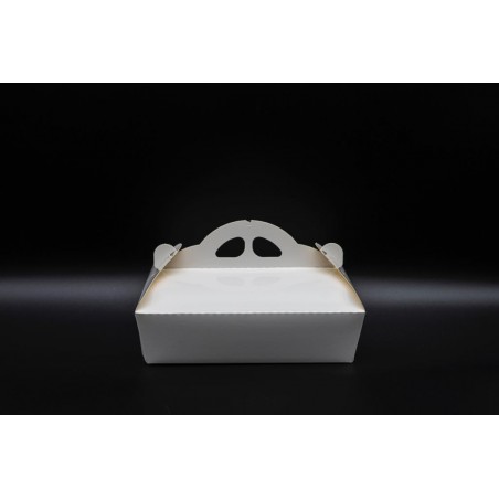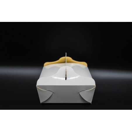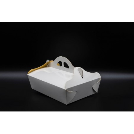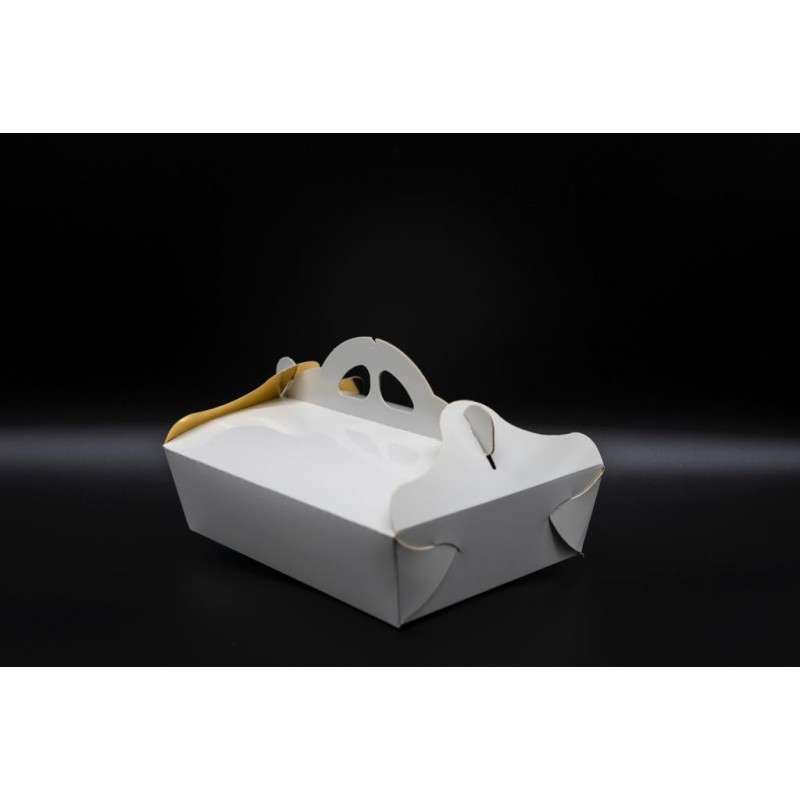 Scatola porta paste plastificata disponibile in 5 colori. Realizzata in cartoncino teso interno in film oro. Un modello elegante con una pratica maniglia ad incastro per il trasporto. Ogni confezione contiene 50 scatole. L'impianto stampa è da pagare solo al primo ordine.