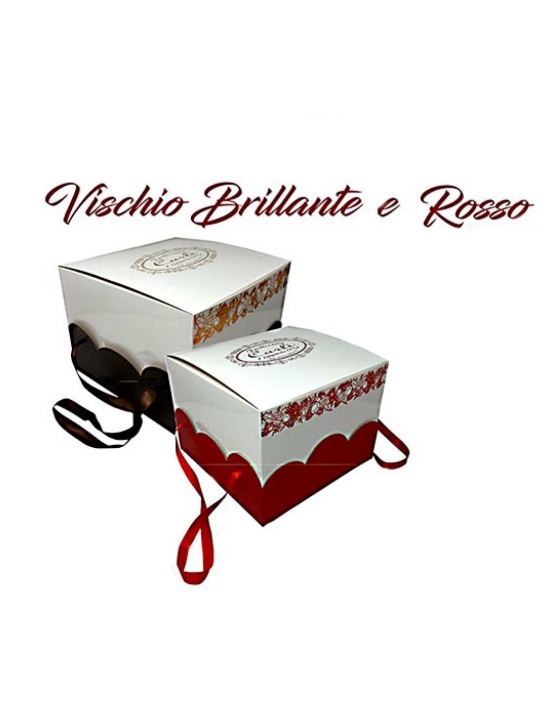 Scatola a fondo automatico realizzata in cartoncino teso GC2 con plastificazione lucida e motivo stampato a caldo. Può essere estratta dalla base in microonda ed è fornita di coppia di manici in raso marrone.