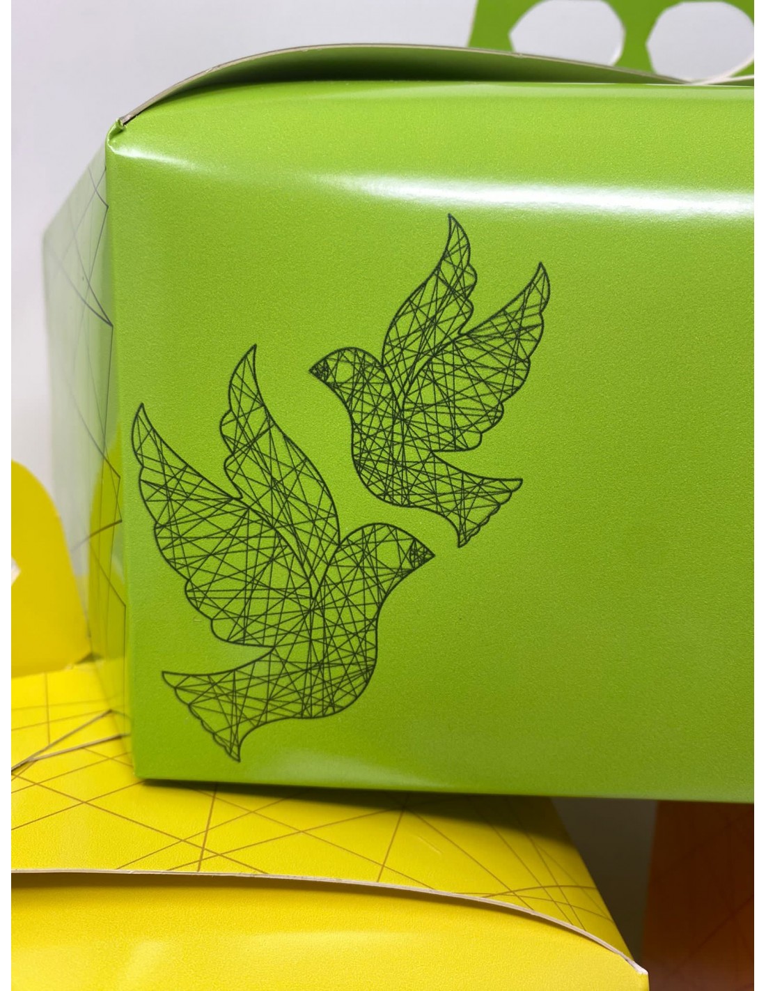 Porta colomba intreccio in tre colori: verde, giallo, arancio. Interno alimentare neutro. La confezione contiene pz. 50.