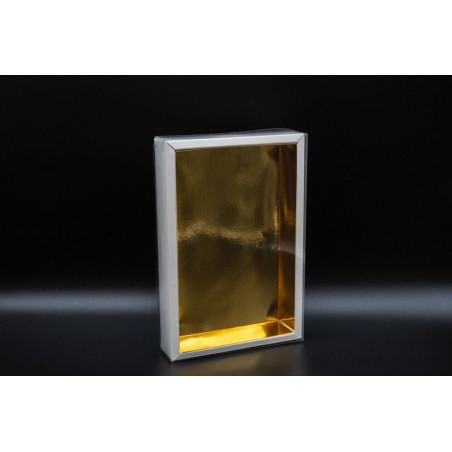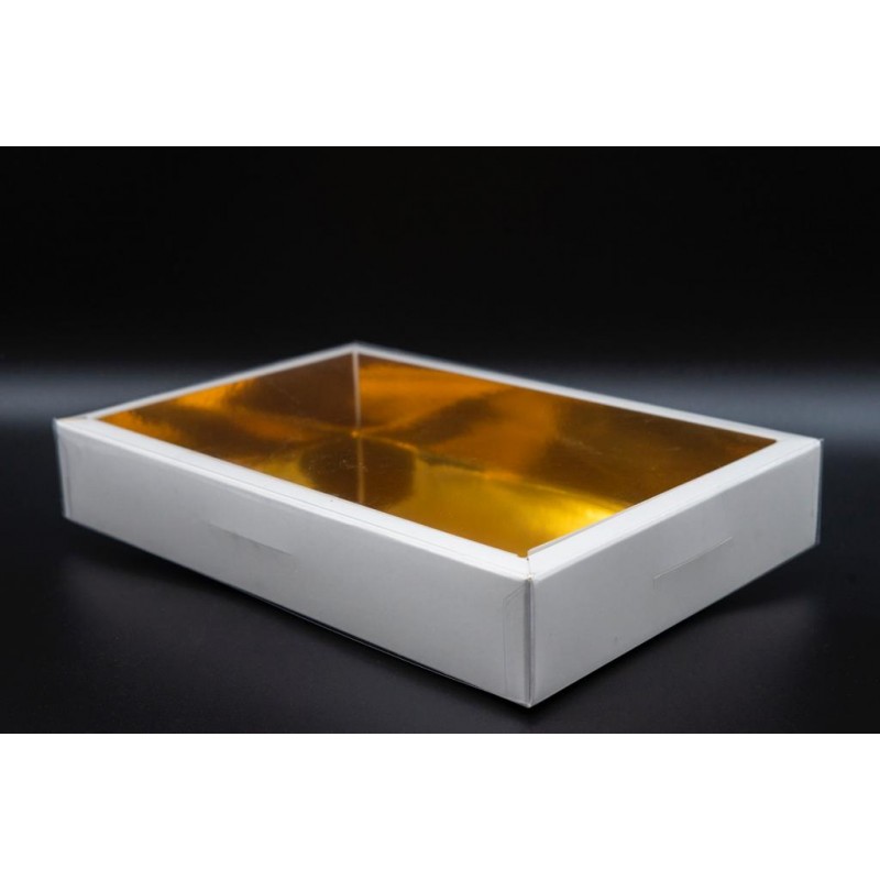 La scatola ideata appositamente per i tuoi biscotti/cioccolatini, con copertura trasparente che permette la visione del prodotto. Interno alimentre oro. Cartoncino teso GC 2.