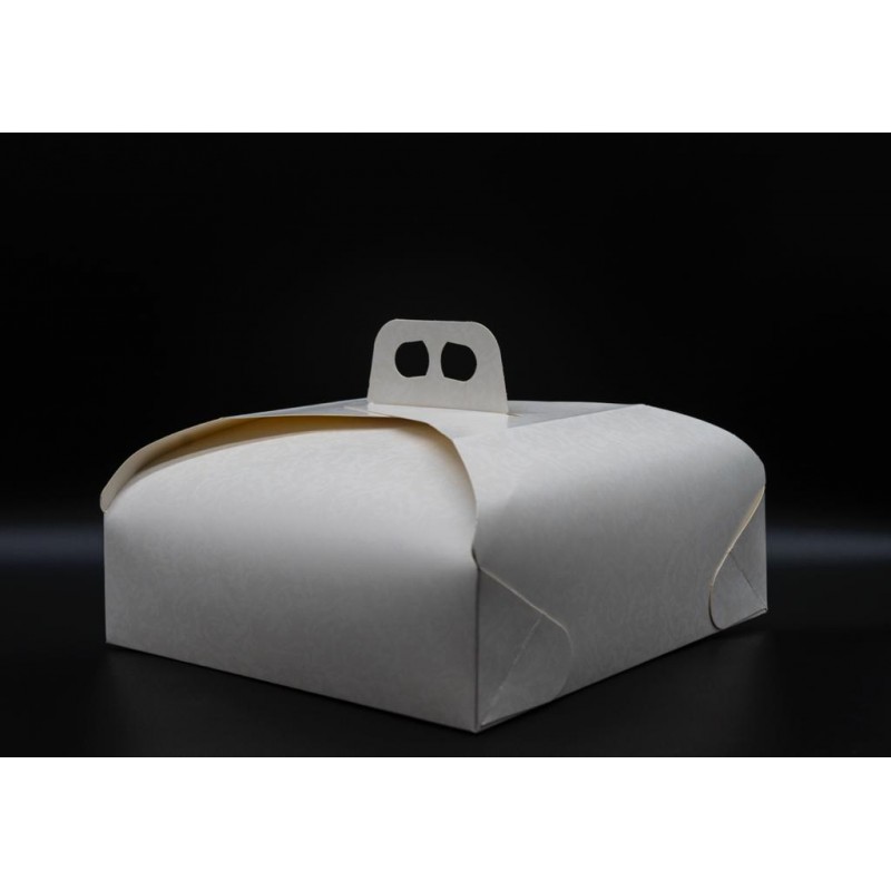 Ideale per contenere torte di varie dimensioni. Interno alimentare neutro. Comoda maniglia per il trasporto. Ogni confezione contiene 25 scatole.